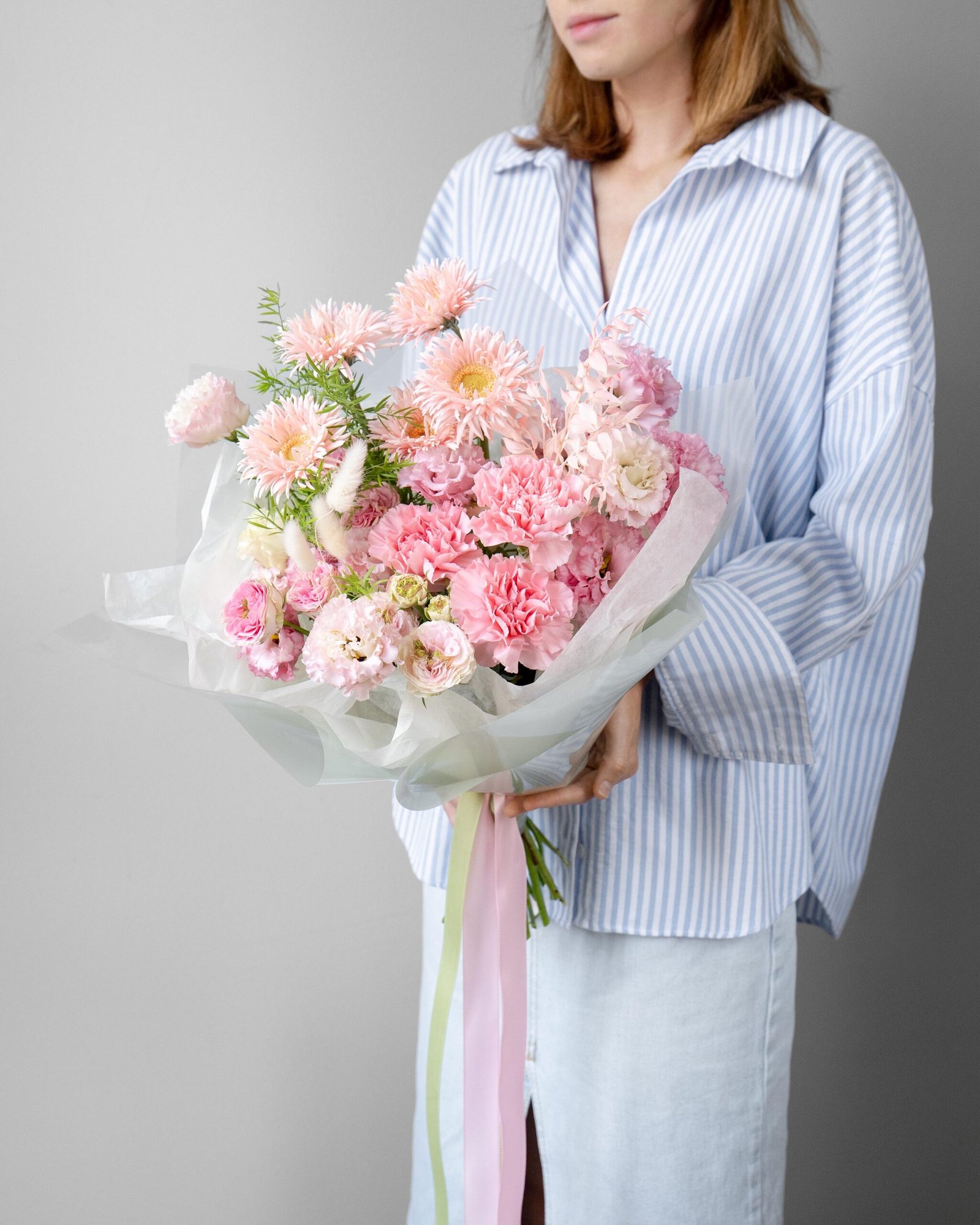 This exquisite bouquet combines delicate flowers that create an atmosphere of tenderness and romance. Carnations bring sophistication and much-needed softness, while Eustoma adds airiness and lightness. Mini Gerberas bring brightness and cheerfulness, and Spray Roses add a sensual accent. Lagurus and Asparagus bring lightness and natural texture to the composition. Preserved Ruscus completes the bouquet, giving it a modern and stylish look. All these elements are carefully arranged in a delicate wrapping that highlights the beauty of each flower, making the bouquet a perfect gift for any occasion.