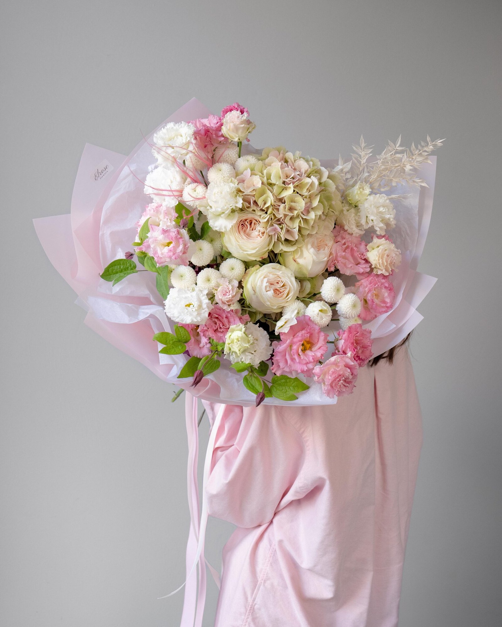 This luxurious and elegant bouquet combines the finest flowers to create a sophisticated and harmonious composition. The rose symbolizes love and beauty, while Spray Chrysanthemum Newton adds lightness and freshness. Eustoma brings tenderness and refinement, and Hydrangea fills the bouquet with fullness and volume. Clematis adds an interesting texture and an exotic touch, while preserved Ruscus completes the composition with a modern and stylish look. All these elements are arranged in a delicate pink wrapping, which enhances the bouquet’s elegance and makes it the perfect gift for any celebration.