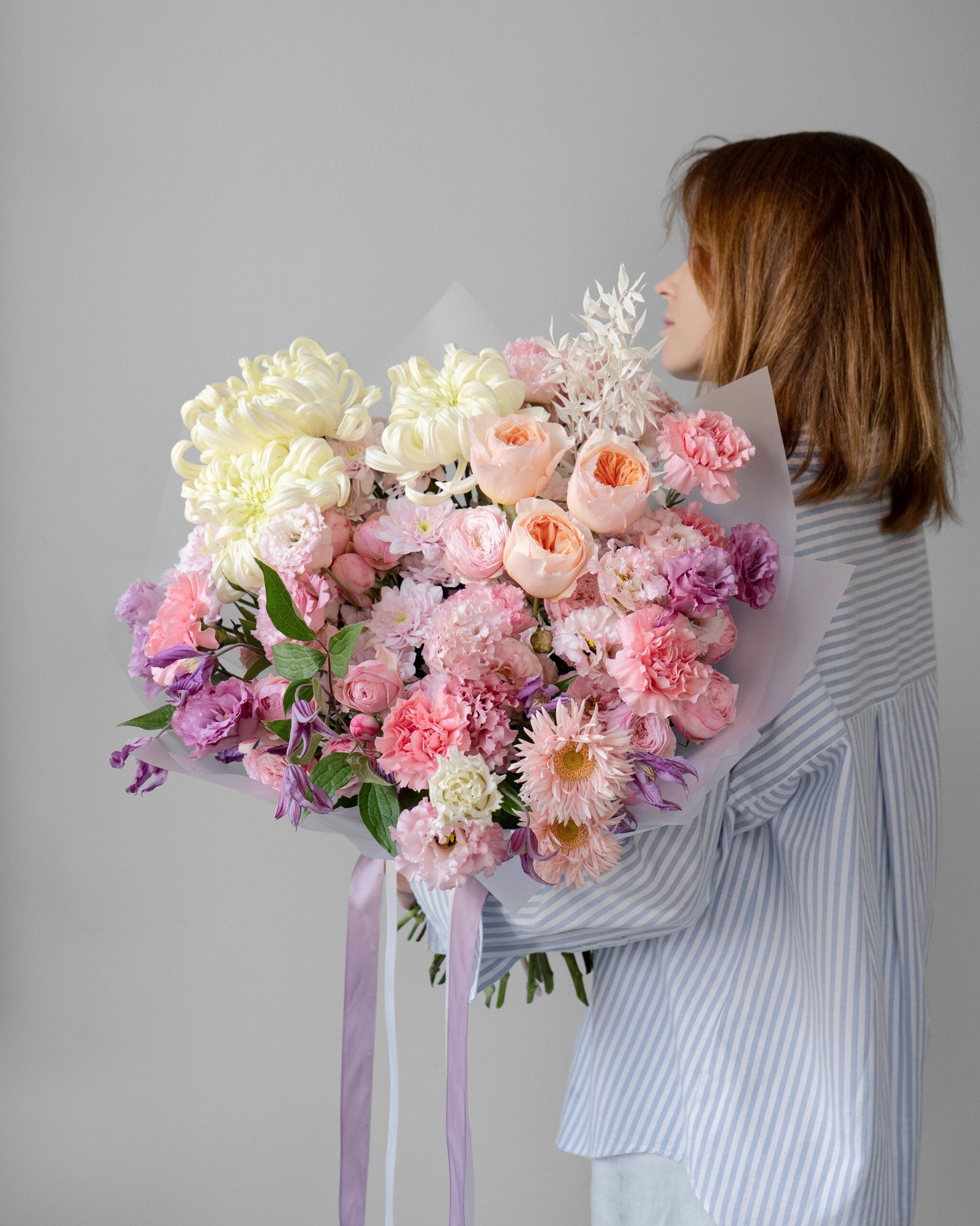 This luxurious bouquet combines a variety of flowers, each contributing its unique beauty and atmosphere. The single chrysanthemum catches attention with its elegance, while the premium garden rose and rose bring harmony and romance. Mini Gerbera adds brightness and freshness, and Eustoma lends lightness and grace. Spray chrysanthemums and spray roses fill the composition with tenderness and volume. Clematis adds an interesting texture and an exotic touch, while preserved Ruscus completes the bouquet with a modern and stylish appearance. All these elements are carefully arranged in a delicate wrapping, highlighting the beauty and refinement of the bouquet, making it a perfect gift for any celebration.