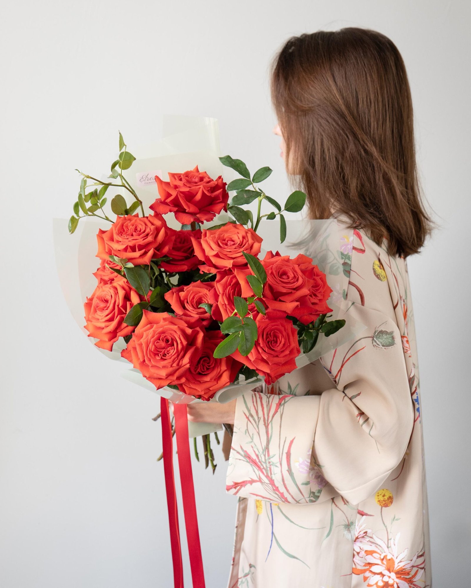 This elegant mono-bouquet of red roses, Rose “Nina,” combines passion and elegance. The red roses, symbolizing love and devotion, express deep feelings, while the foliage adds naturalness and sophistication to the composition. The bouquet is arranged in a delicate transparent wrapping, emphasizing its simplicity and style. This bouquet is a perfect gift for those who appreciate the beauty and symbolism of red roses, making it ideal for romantic encounters, confessions, and special occasions.