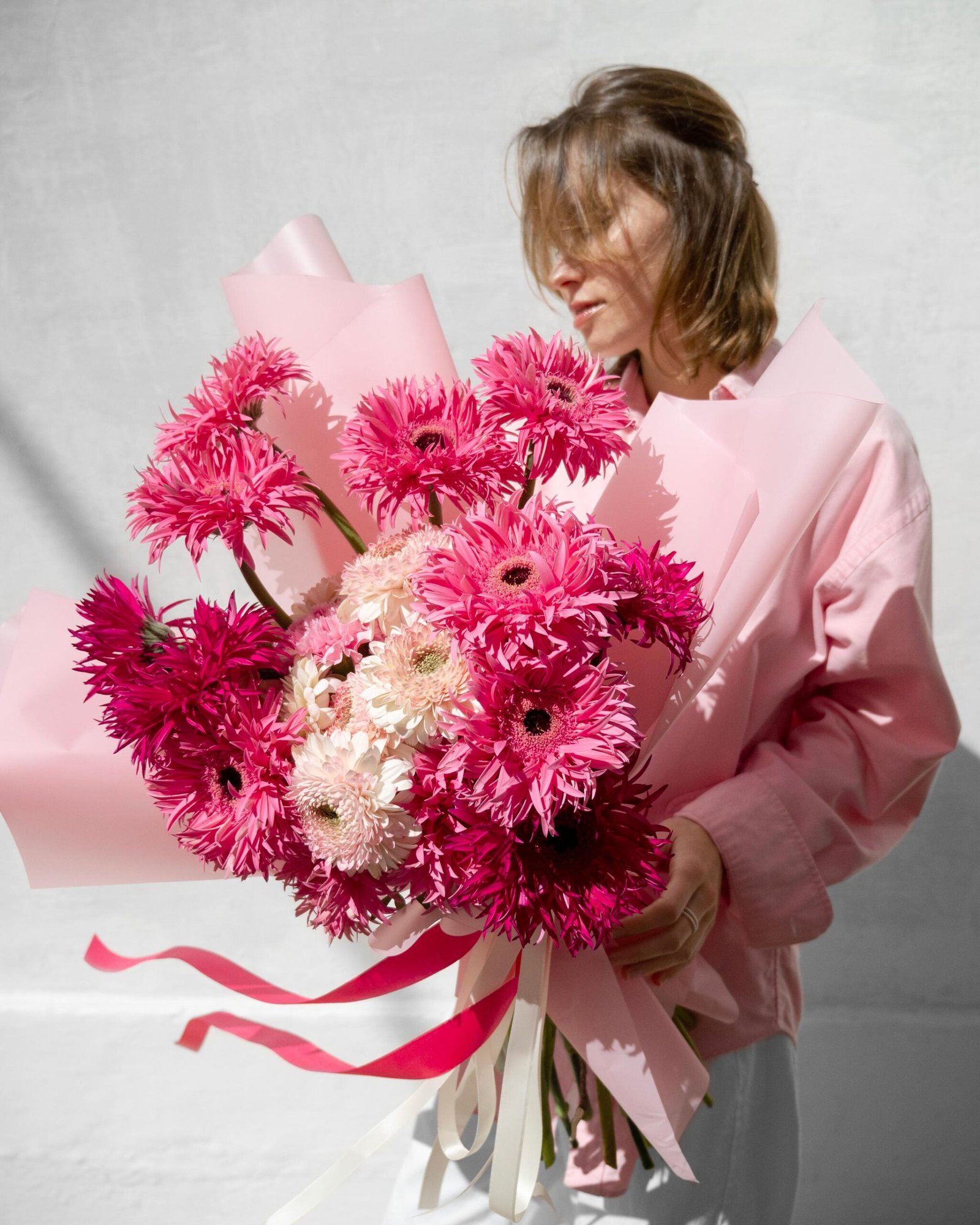 This vibrant and energetic bouquet of gerberas in a rich pink shade brings joy and freshness to any day. Bright, almost flame-like flowers become the centerpiece of the composition, filling the space with vivid hues and energy. Each gerbera symbolizes optimism and positivity, creating an atmosphere of fun and lightness. This bouquet makes an excellent gift for any celebration or simply to make someone’s day special and unique.